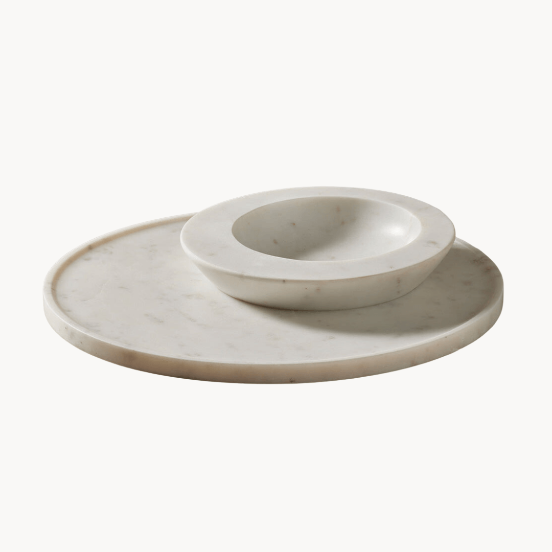 Both timeless and contemporary, marble is one of those enduring materials that we return to season after season. We think it adds a touch of opulence and luxury to any space, but also love juxtaposing it with raw, rustic textures. In our home, for instance, we pair marble accents with wooden candle holders, coloured glass votives or vintage brass trinkets. And this rule applies to our dining table and kitchen, too. Crafted by hand from natural food-grade stone, our Axis marble bowl and platter set is chic while remaining practical enough for daily use. From dinners with loved ones to lavish themed soirees, this duo will enhance and elevate each of your curated tablescapes.
