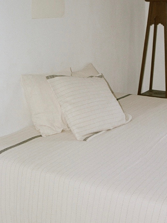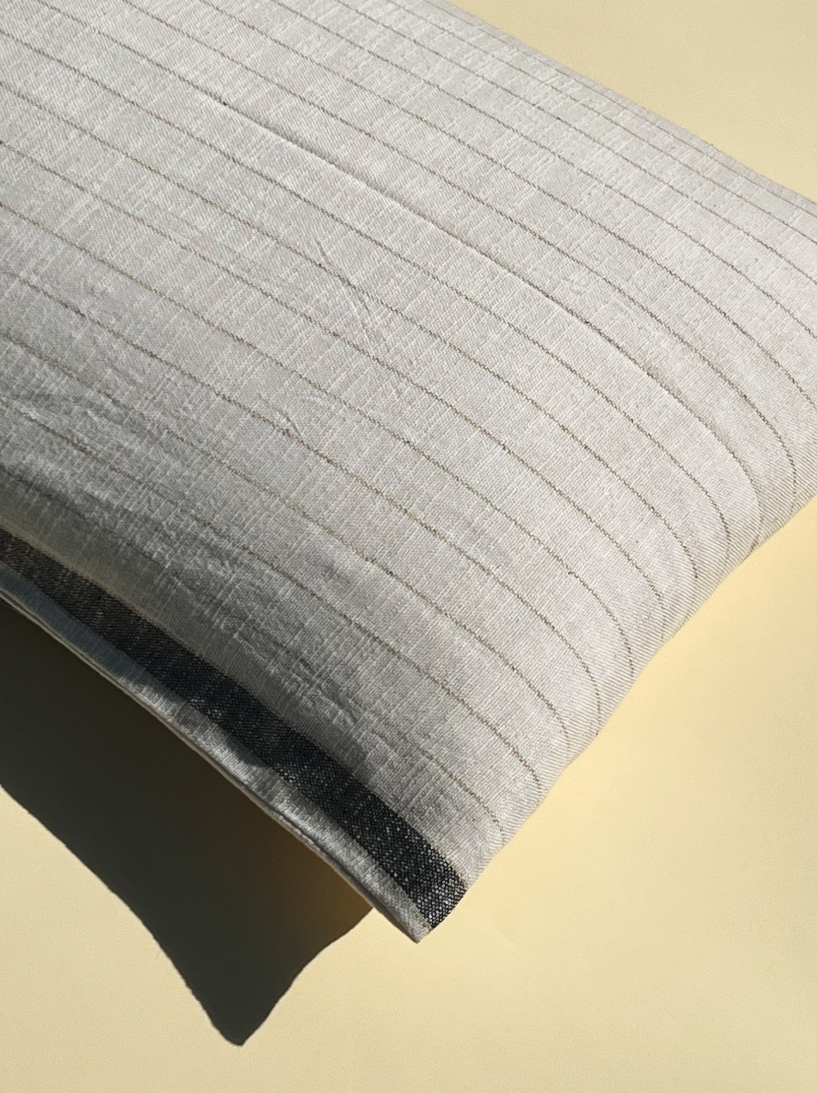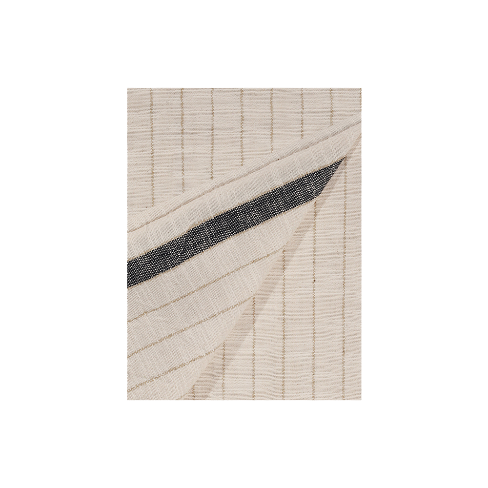 Wide black stripes on both sides and thin golden stripes on a natural fabric.
