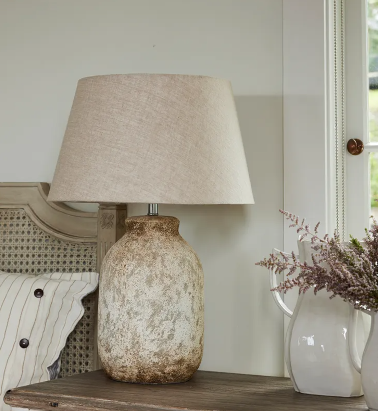 Rustic terracotta lampbase, features a textured off white finish for a modern organic style.