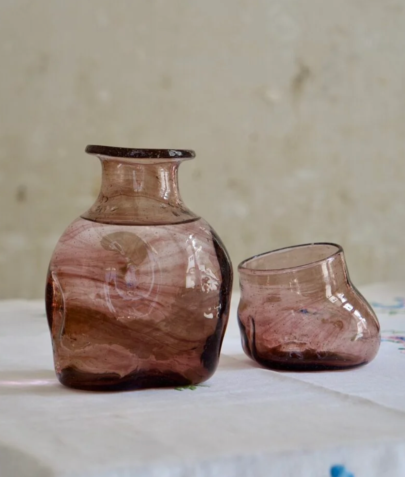 The Rock Carafe Small is a unique and elegant piece of glassware designed to resemble a natural rock formation. It is mouth-blown from recycled glass, which gives it a stunning appearance. The framboise color is a deep, rich shade of raspberry red that adds a touch of sophistication and vibrancy to the piece. This vessel is perfect for use as a carafe for water, wine, or other beverages. Pair it with the Rock Glasses to make a stunning set. It is also a great choice for displaying fresh flowers or other decorative items. The Rock Carafe Small is a beautiful and eye-catching addition to any home decor.