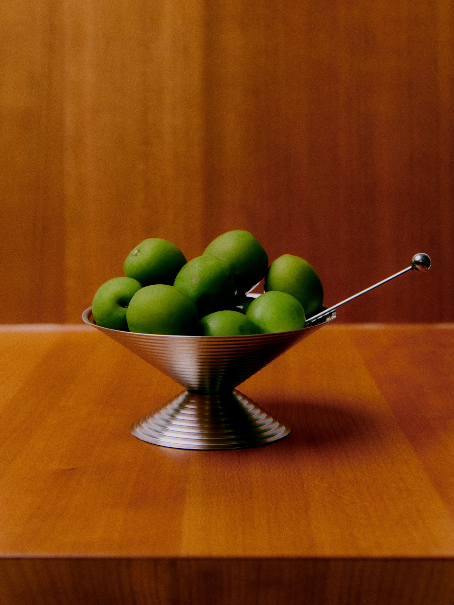 Based on two interdependent shapes, the design offers both stability and presence. Its elevated, geometric silhouette makes it ideal for serving ice cream, olives, salt, or small snacks — a versatile object meant for everyday use.