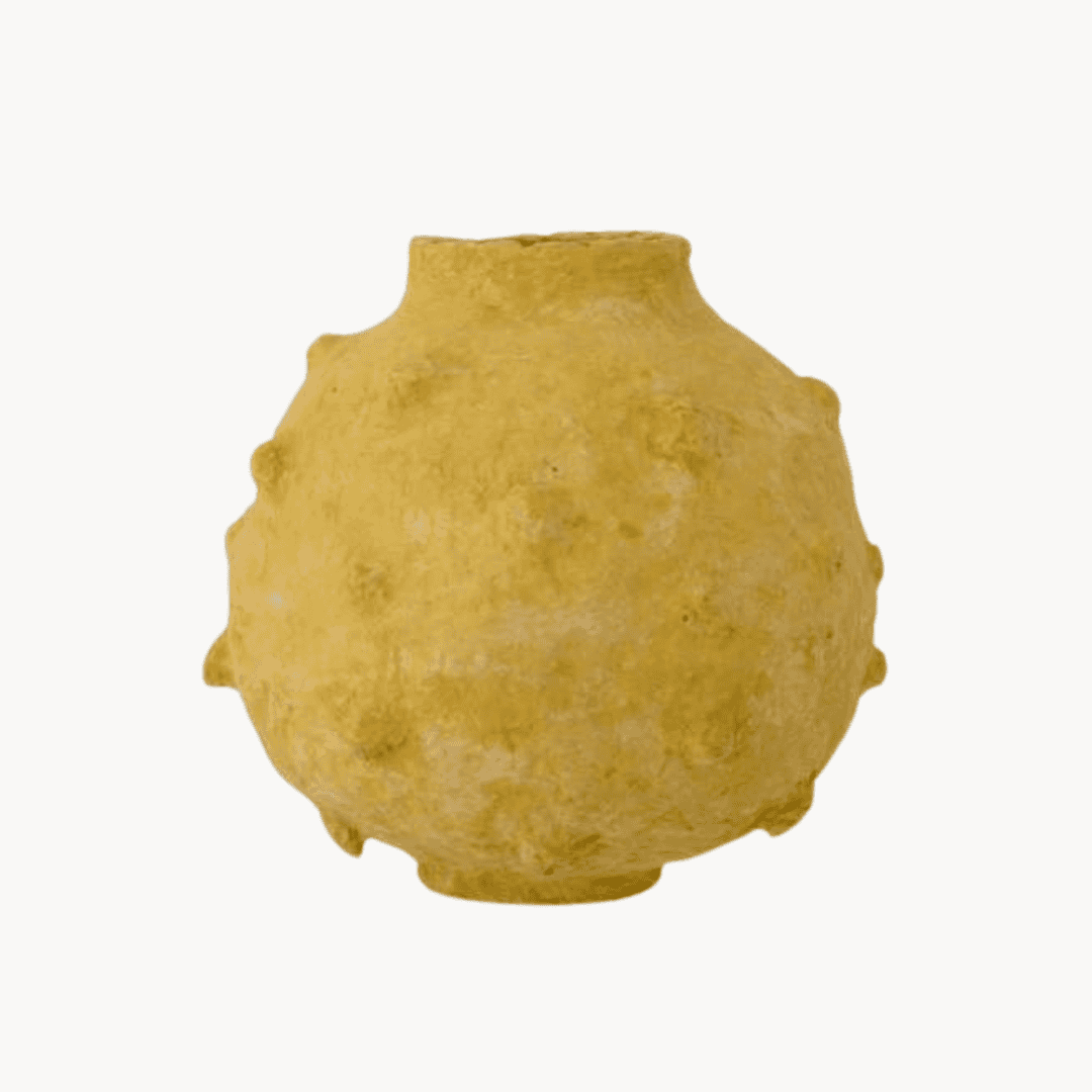 The Kalmar Deco Vase from Creative Collection will add charm to your home decor with a beautiful yellow color. The vase is handmade of paper mache with spikes. Each will vary and be unique. For decoration only.