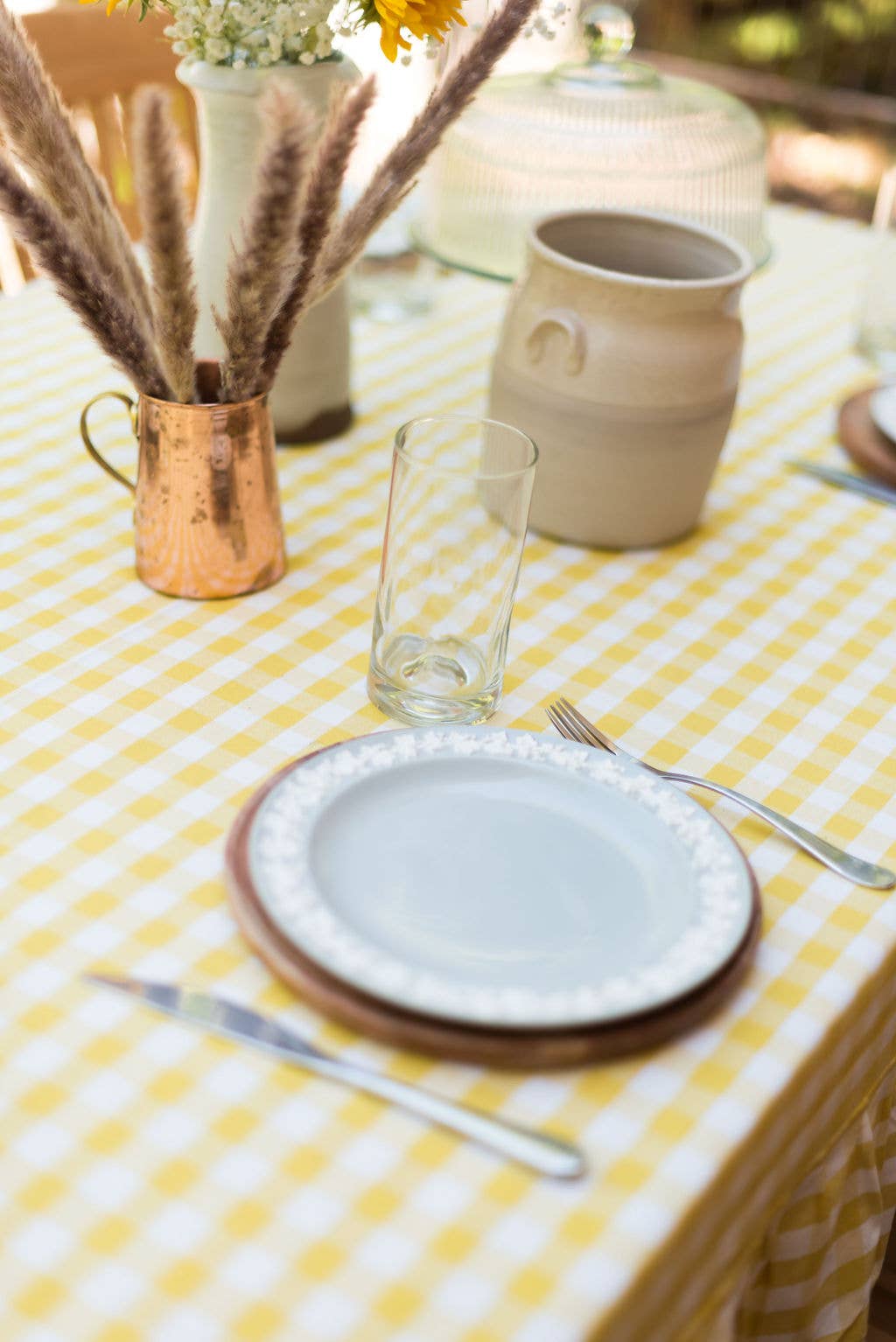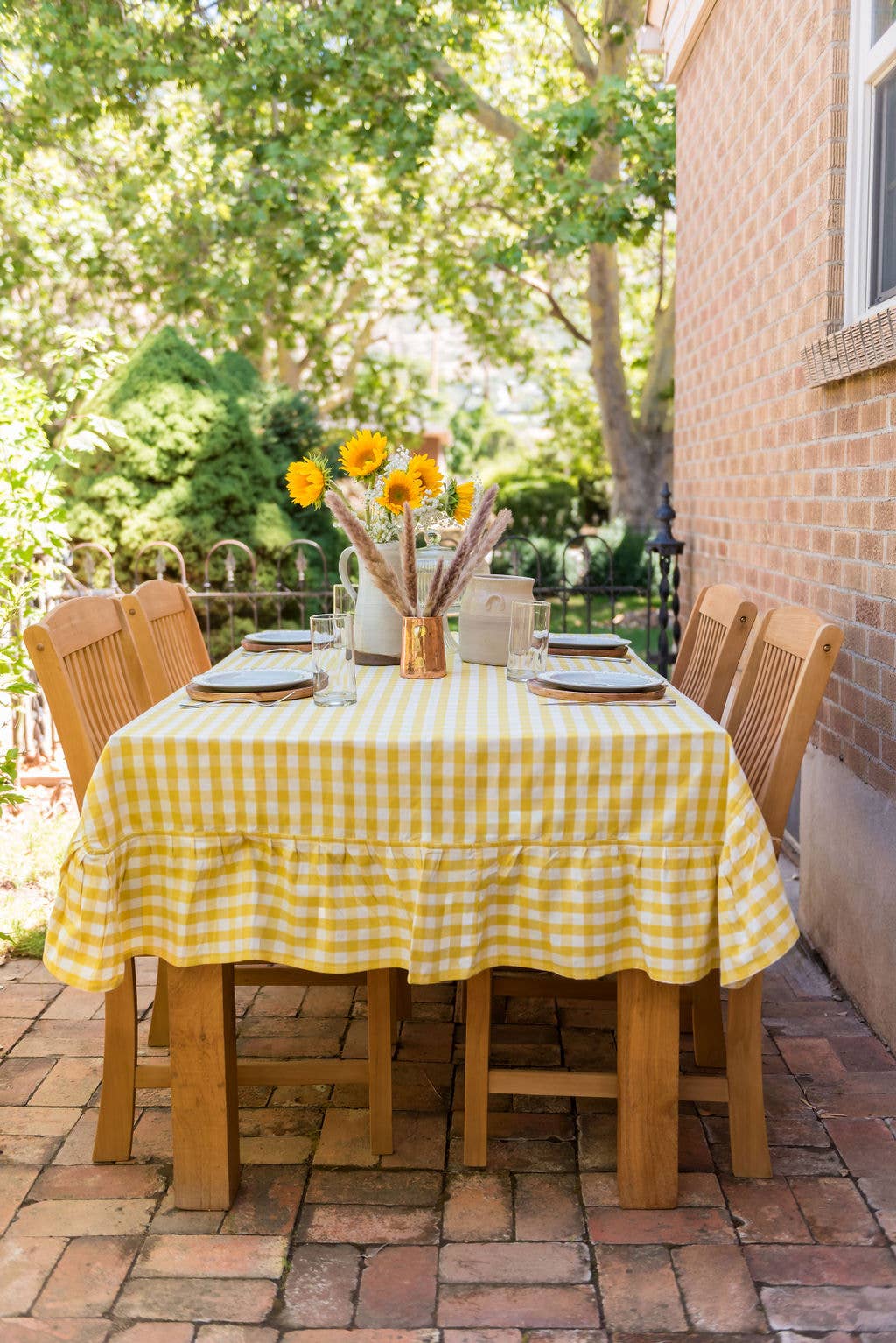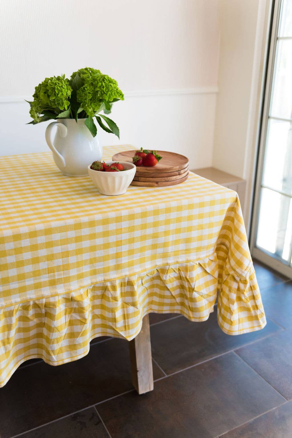Galley and Fen uniquely designed tablecloth is made from high quality 100% cotton. This European inspired tablecloth is perfect for casual dinners to formal occasions and weddings. Our tablecloth features a timeless yellow and white gingham pattern, a flirty ruffle, a heavy weave and is machine washable (we recommend washing in cold water and tumble dry or air dry). Our rectangular tablecloth comes in three different sizes: 60" x 60", 60" x 90" and 60" x 120". These sizes will work with most standard square and rectangular dining tables. Whether you are wanting a formal table spread or simply a casual setting, these linen tablecloths are just the thing.
